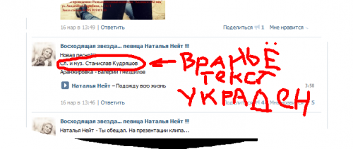 Жень, обид ни каких на твое мнение нет, но ты упустил один существенный момент. Песни Высоцкого, которые ты привел в пример просто перепевают разные исполнители с тем же текстом и музыкой и не забывают упомянуть автора. А мой текст просто беспросу взяли, заменили пару строк, кое что ваще отрезали и написали другую музыку, указав автором себя. Это ты называешь положительный момент? Пусть песня поется? Нет!!! Она будет петься в том виде, в котором мы написали ее с Колей и тут даже не может быть обсуждений о каком либо пиаре текста под другим соусом.