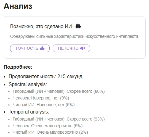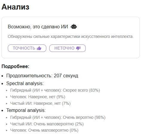 Я не понимаю, почему вы не слышите различие вокалов между ИИ и живым человеком? Там идёт дополнительный металлический отзвук, который сразу слышен!