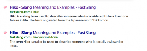 Hiko — сленговое слово, которое используется для описания человека, которого считают неудачником или провалом в жизни. Термин произошёл от японского слова «hikikomori», которое обозначает человека, уходящего от общества и изолирующегося в своём доме.